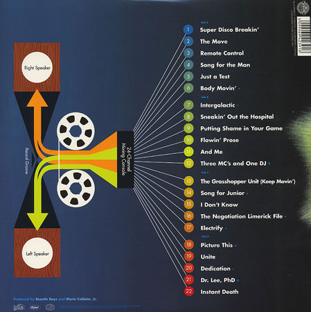 The front cover is in reference to “MCA, where have you been? Packed like sardines in a tin” from Body Movin’, and just look at how happy MCA actually is sat in the middle of that tin. He’s positively beaming! Looking at it now after his death, it really warms my heart and reminds me how much fun MCA and the Beastie Boys really were.