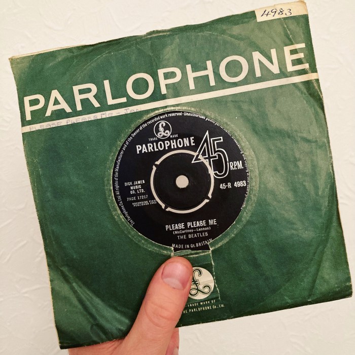(My Mum’s copy of Please Please Me. Note that she’s written the title of the track and the month she bought it on the white panel on the sleeve. Please Please Me is also fairly unique in that it’s one of only two Beatles singles to bare the songwriting credit McCartney-Lennon.)