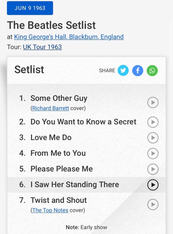 Note the early inclusion of Do You Want to Know a Secret. If this set is accurate then it means that the first original Beatles song that my Mum would have seen live would have been sung by George! Quite fitting really.